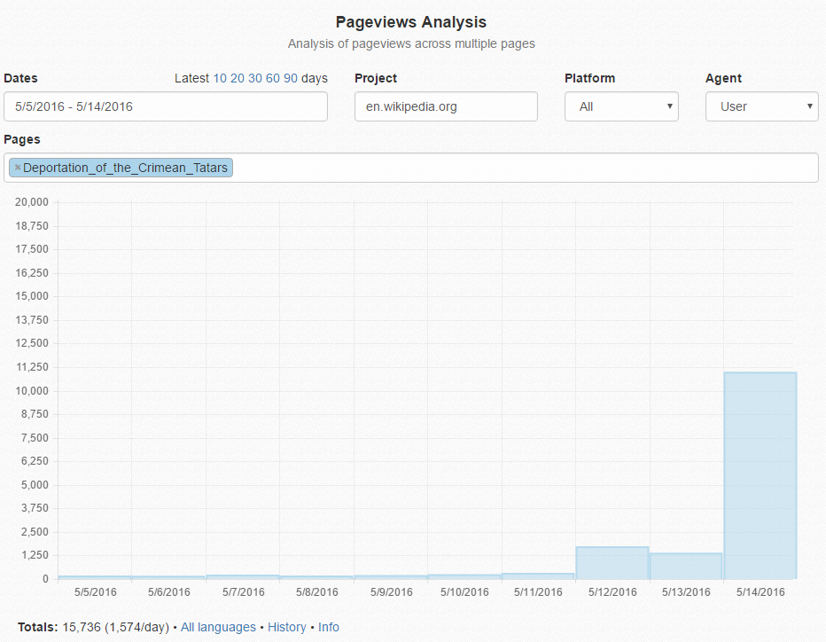 Date: 2016-05-15 05:40 pm (UTC)https://tools.wmflabs.org/pageviews/#project=en.wikipedia.org&platform=all-access&agent=user&range=latest-10&pages=Deportation_of_the_Crimean_Tatars